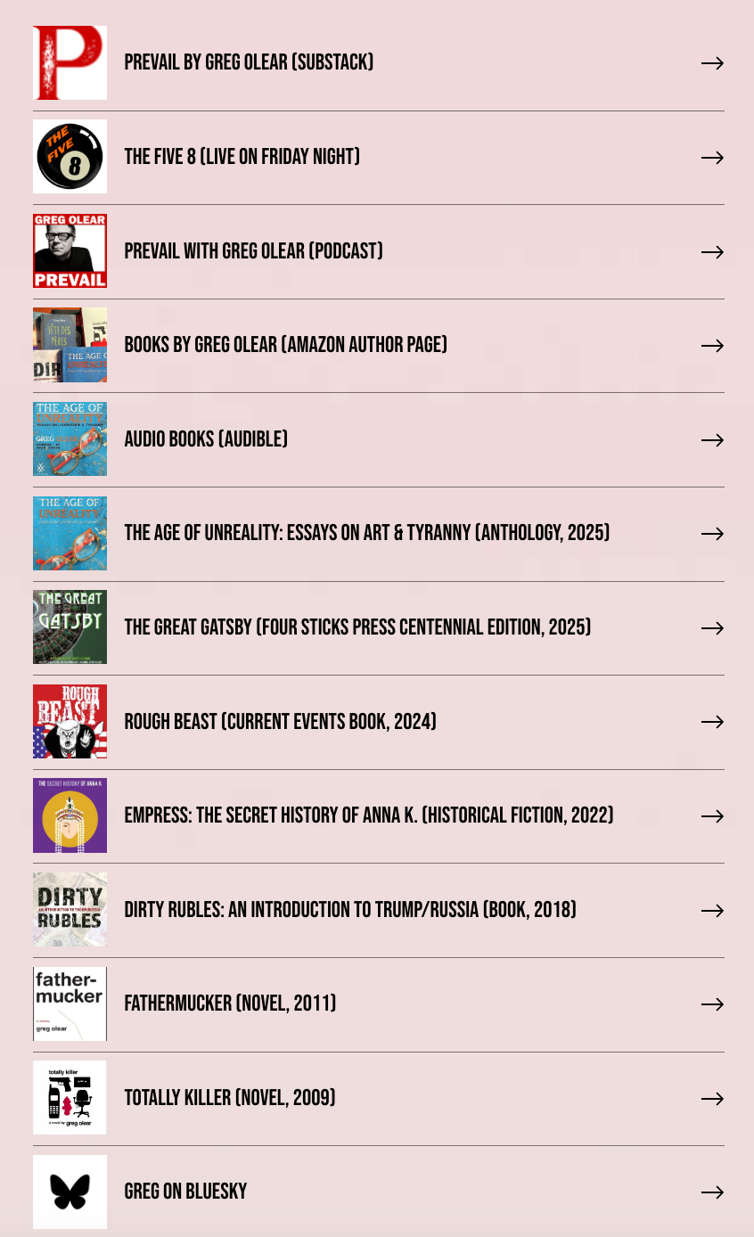 Greg Olear (@gregolear.bsky.social) is the L.A. Times-bestselling author of three novels and four nonfiction books, including Dirty Rubles: An Introduction to Trump/Russia (2018) and Rough Beast: Who Donald Trump Really Is, What He’ll Do If Re-Elected, and Why Democracy Must Prevail (2024). His newest book is The Age of Unreality: Essays on Literature & Tyranny. He is the cohost of the weekly live show The Five 8 and the host of the PREVAIL podcast. His Substack column, PREVAIL, has run on Tuesday, Friday, and Sunday since 2019. He thinks you should read The Great Gatsby again.