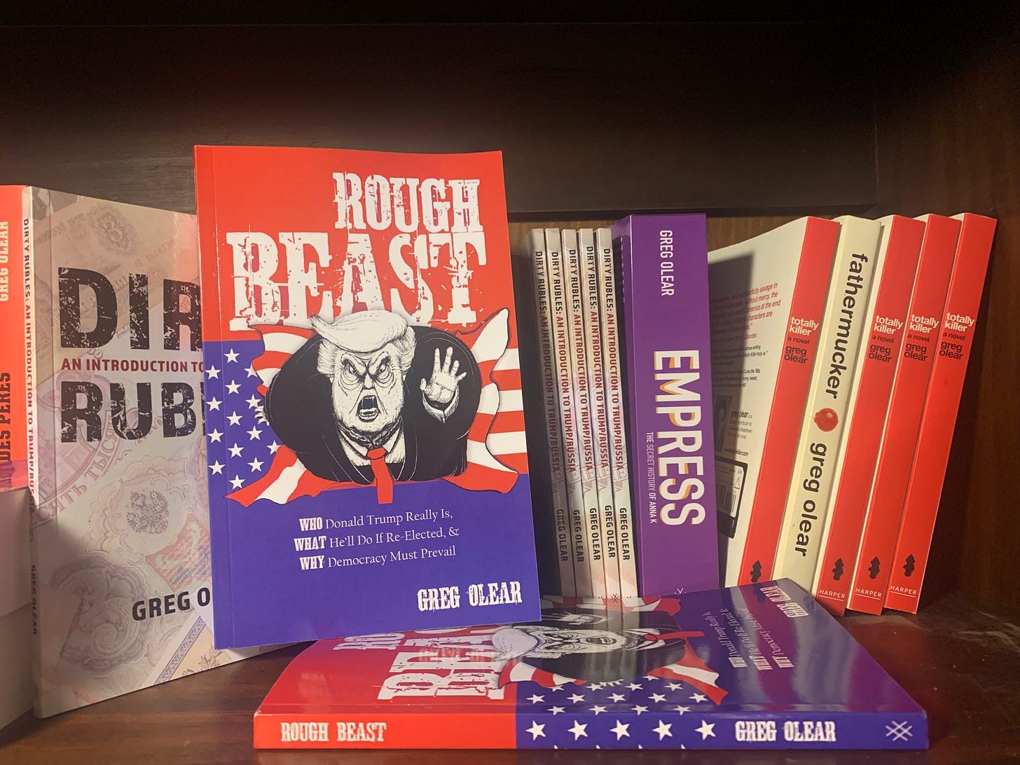 Greg Olear (@gregolear) is the L.A. Times-bestselling author of the novels Totally Killer (2009), Fathermucker (2011), and Empress (2022), as well as Success Stories of a Failure Analyst (2023) and 2018’s Dirty Rubles: An Introduction to Trump/Russia, which Salon called “required reading for all Americans.” His first two novels have been translated into other languages and have been optioned for screen. His latest book is ROUGH BEAST: Who Donald Trump Really Is, What He’ll Do If Re-Elected, and Why Democracy Must Prevail, now available in paperback and ebook on Amazon and as an audio book at Audible.