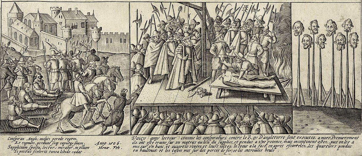 Photo credit: Top and bottom: Rendering of the Gunpowder Plot conspirators and their fate by the Dutch illustrator Crispijn van de Passe the Elder, 1606.