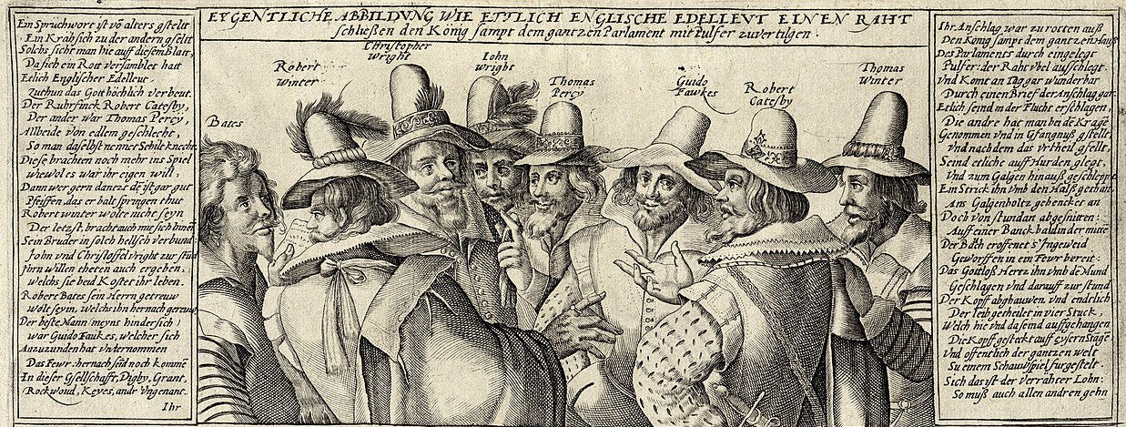IN THE WEE HOURS of November 5, 1605, a Yorkish mercenary named Guy Fawkes was busted in a basement beneath the House of Lords with enough explosives to blow the place to smithereens. That was, indeed, the plan. He and his co-conspirators intended to detonate the explosives during the State Opening of Parliament later that day, with the aim of killing King James I and everyone else inside.
