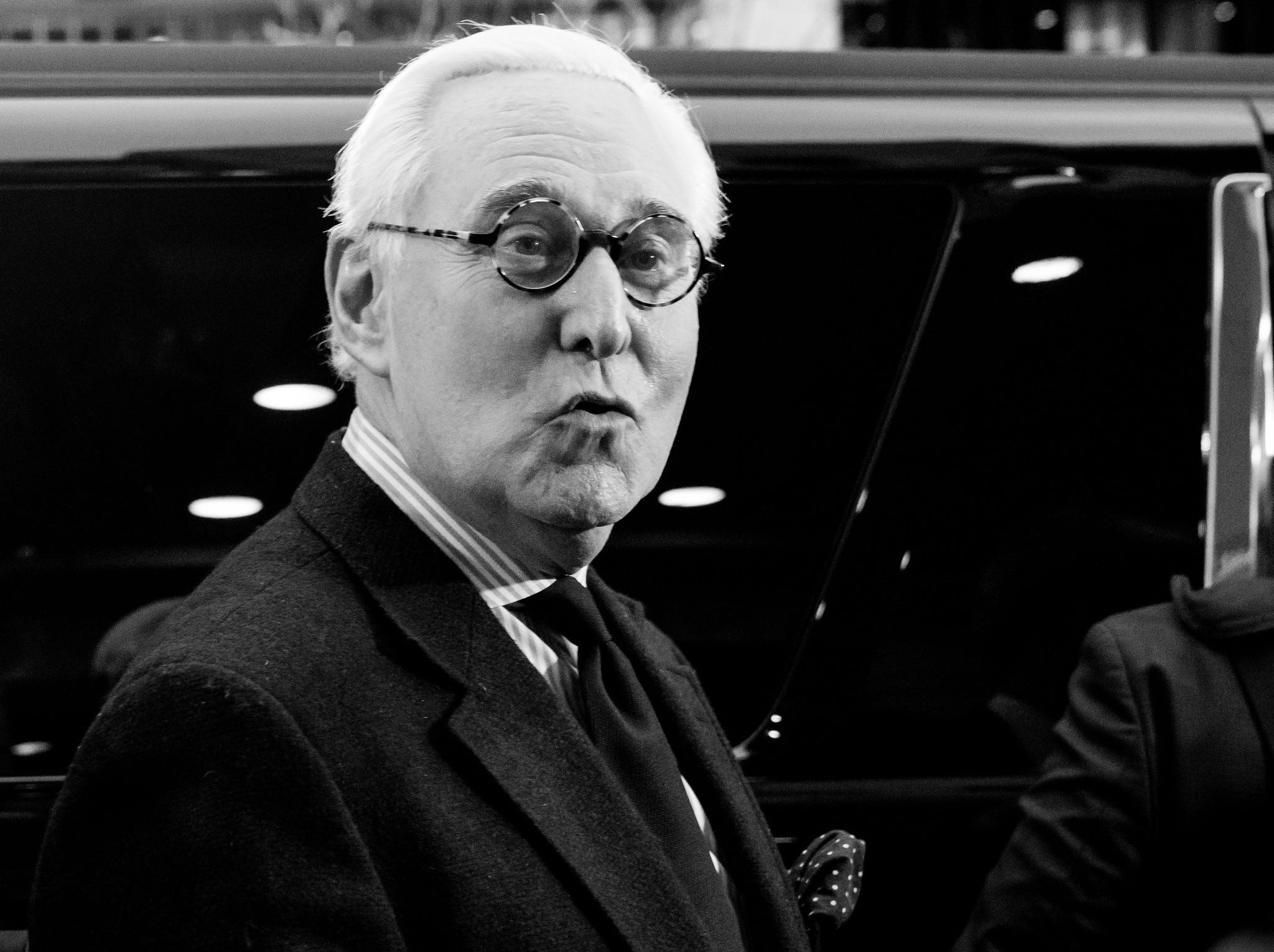 Photo credit: Victoria Pickering. Roger Stone leaving the courthouse after the hearing on the request for a new trial (he's sucking a candy, hence his facial expressions), February 25, 2020.