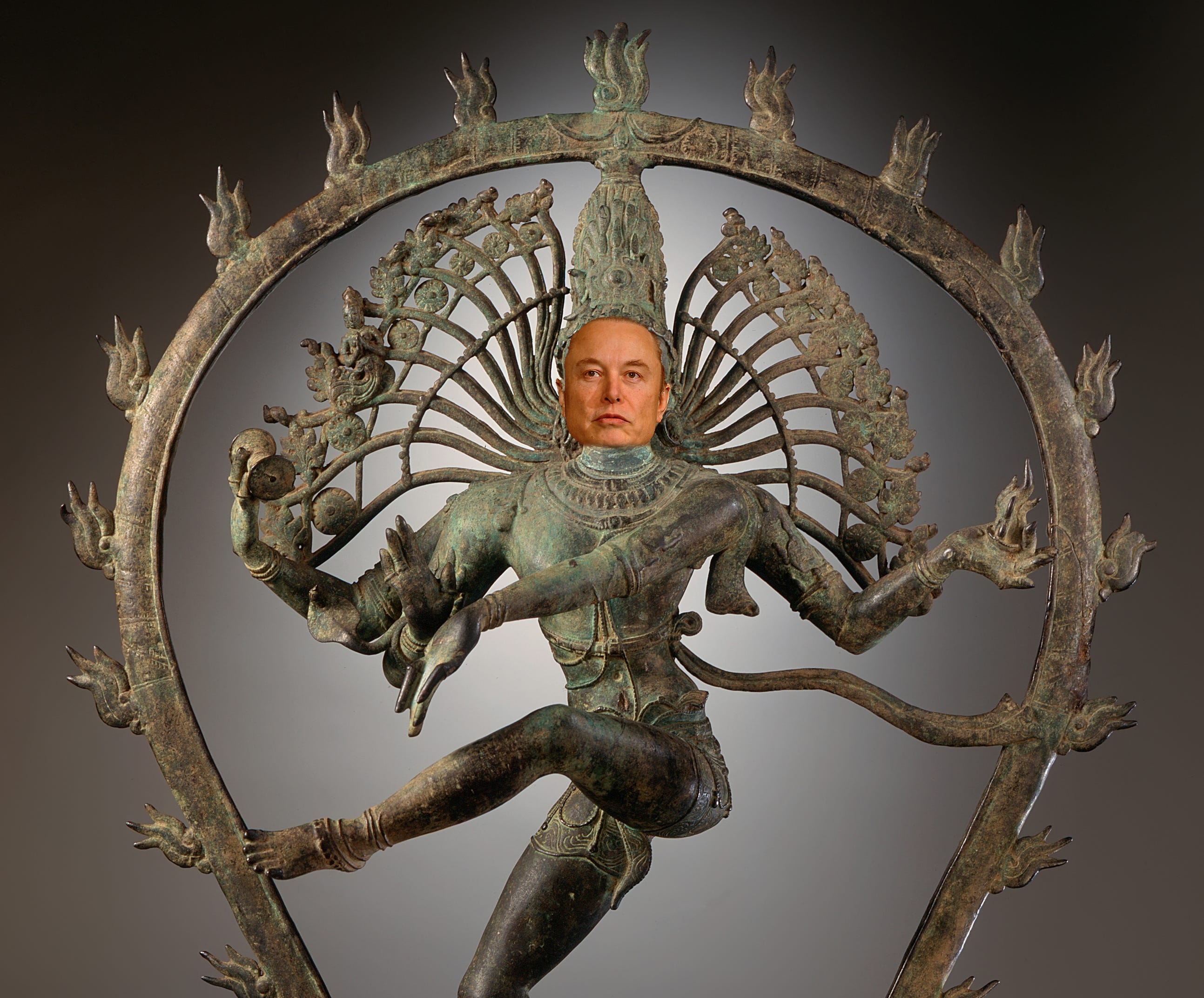 Photo credit: Los Angeles Museum of Art. Chola-era statue showing Shiva the Destroyer dancing. Elon Musk’s dumb face: U.S. AIR FORCE ACADEMY, Colo. Tesla Inc. Chief Executive Officer Elon Musk speaks with Lt. Gen. Richard Clark, Superintendent of the U.S. Air Force Academy, during the Ira C. Eaker Distinguished Speaker Presentation in the Academy's Arnold Hall on April 7, 2022 in Colorado Springs, Colo.