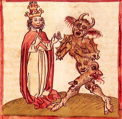 Photo credit: Pope Silvester II. and the Devil. Miniature from Martinus Oppaviensis' Chronicon pontificum et imperatorum, Cod. Pal. germ. 137, Folio 216v, ~1460.