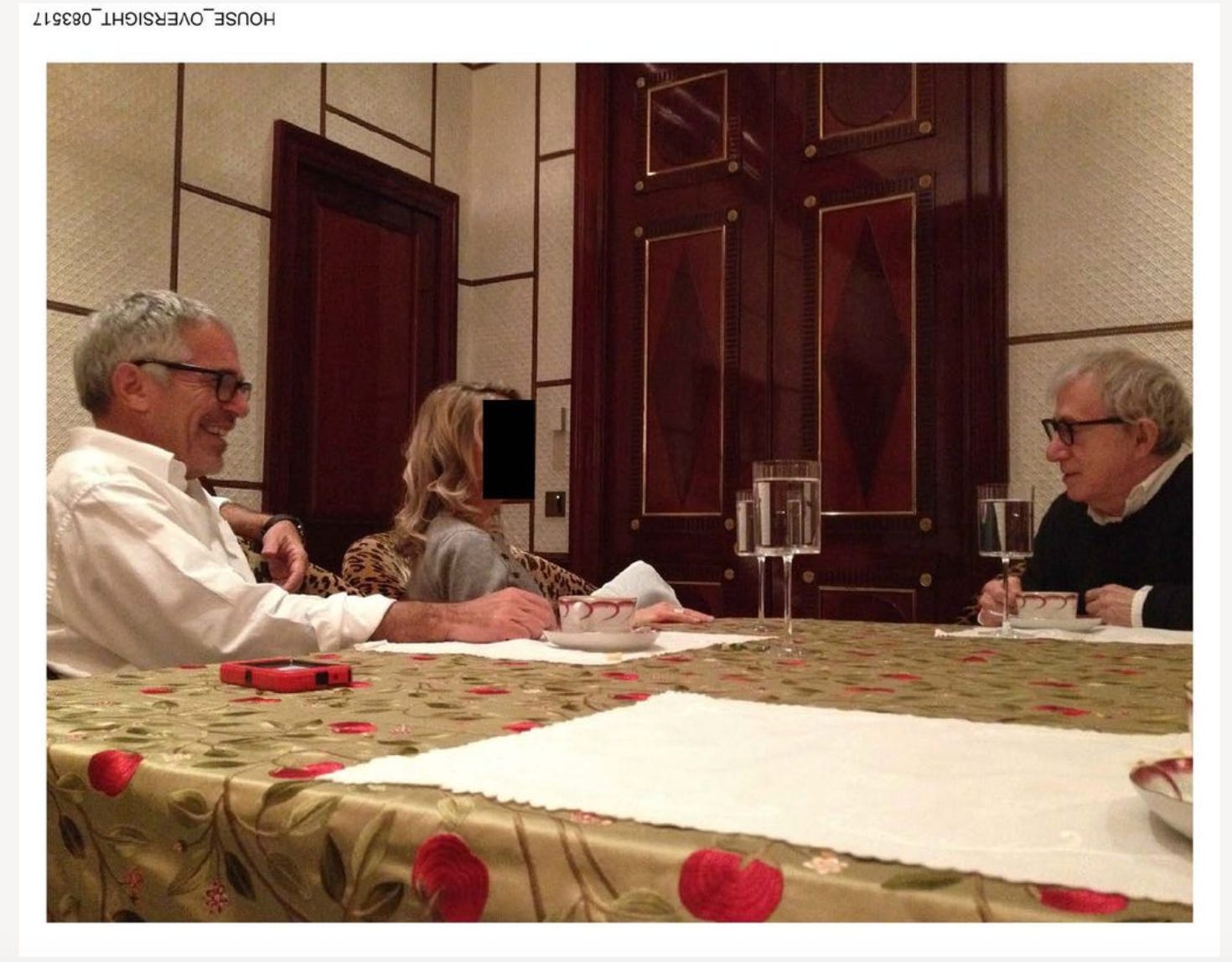 For example: In one of the photos, a blonde woman, whose face is obscured, sits at a table—draped, incidentally, with one of the most hideous tablecloths I’ve ever seen—between Jeffrey and Woody. Who is she? Is she a victim? Is this a ploy to get her to cooperate? Or has she already cooperated, and that’s why she’s redacted—so the others know she’s cooperating?3