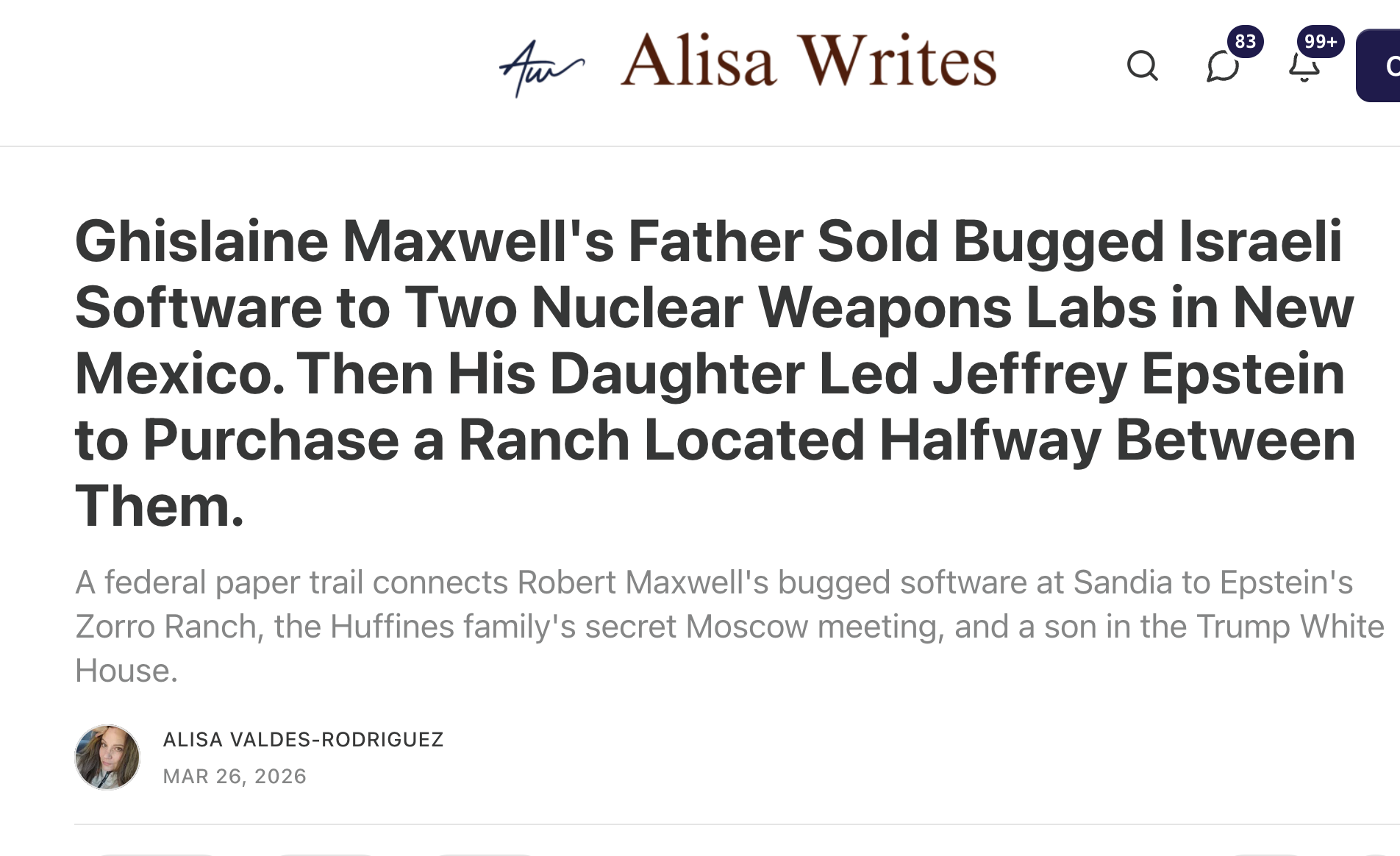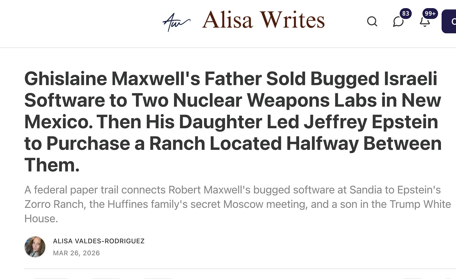 The chronology is as follows: Robert Maxwell, alleged Mossad and multi-agency intelligence asset, penetrated Sandia National Laboratories with surveillance software in 1985. His daughter Ghislaine became Jeffrey Epstein’s operational partner in the 1990s, after Robert’s mysterious death in 1991. Epstein purchased Zorro Ranch — positioned near the midpoint between Sandia and Los Alamos — from the governor of New Mexico, built a private microwave communications link to Sandia Crest, and operated the ranch as a hub of what federal prosecutors described as an international sex trafficking and blackmail network for nearly three decades. Upon Epstein’s death, his estate — including Zorro Ranch — passed to Karyna Shuliak, a Belarusian national introduced to Epstein through Russian contacts, who was in Russia the day he died. The ranch was subsequently sold to a Texas family whose documented Russian contacts include a secret Moscow meeting with sanctioned officials, whose son sits in the Trump White House, and who has kept Epstein’s private microwave link to Sandia Crest running in Epstein’s company name.