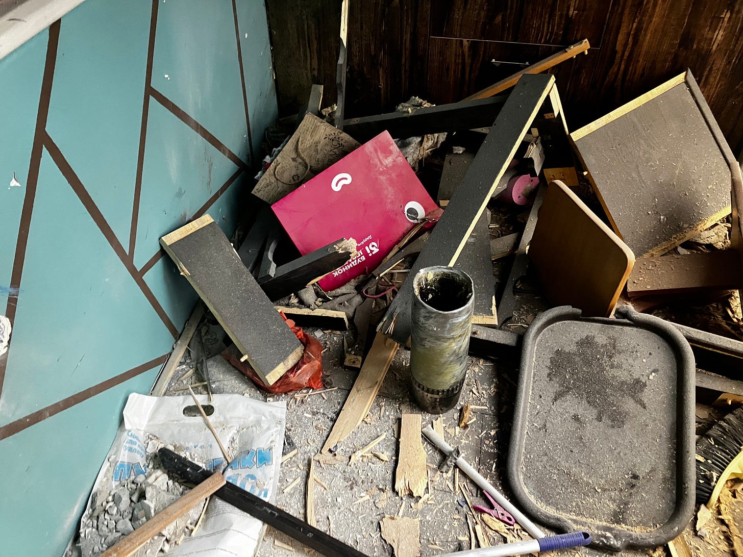 “Shahid” drones are nicknamed “mopeds”: they whizz and buzz. The disgusting racket mixes with the dry claps of automatic guns the Ukrainian air defense uses to shoot the “mopeds” down. In December, a drone screeched and shrieked by my window at night and, in my half-sleep, I saw a wicked witch on a dilapidated motorized mop rattling by at a dizzying speed. Such flights always end with a bang of explosion, glass jingling and crackling against the ground, dogs barking, and crows cawing.