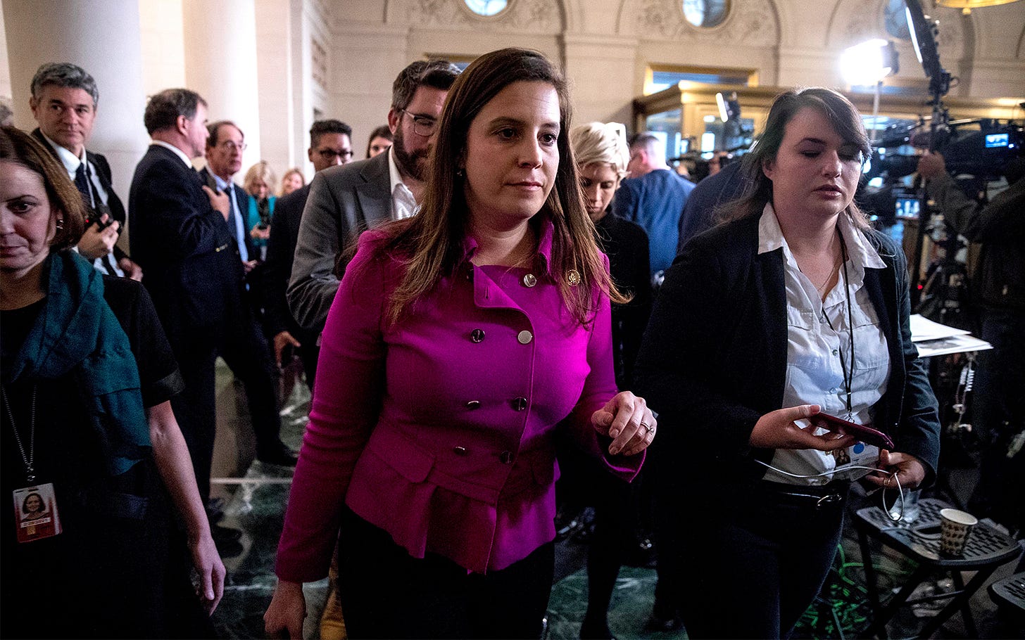 Photo credit: Rep. Elise Stefanik, a Republican from New York, following testimony from former US Ambassador to Ukraine Marie Yovanovitch before the House Intelligence Committee on Capitol Hill in Washington, November 15, 2019. (AP Photo/Andrew Harnik)