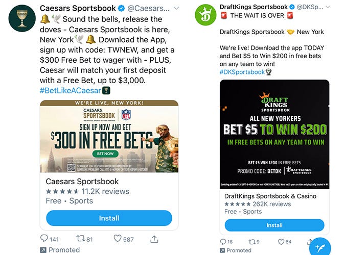No more. Over the last three years or so, the Raiders have moved to Vegas, and online betting industry has made enormous inroads. What was once available in only a few states is now legal in many more, including—as of this past weekend—New York. It is all over my Twitter feed: