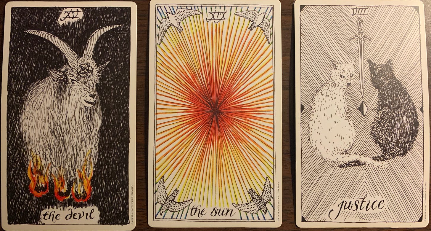 You don’t need to know a damned thing about tarot to figure out the meaning here—past, present, future, left to right. And I swear to god I’m not making this up. These really are the cards I drew: