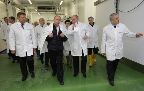 Photo credit: Russian Federation. Prime Minister Vladimir Putin tours the new factory Concord, which supplies pre-prepared meals to schools, 2010. Prigozhin is next to him.