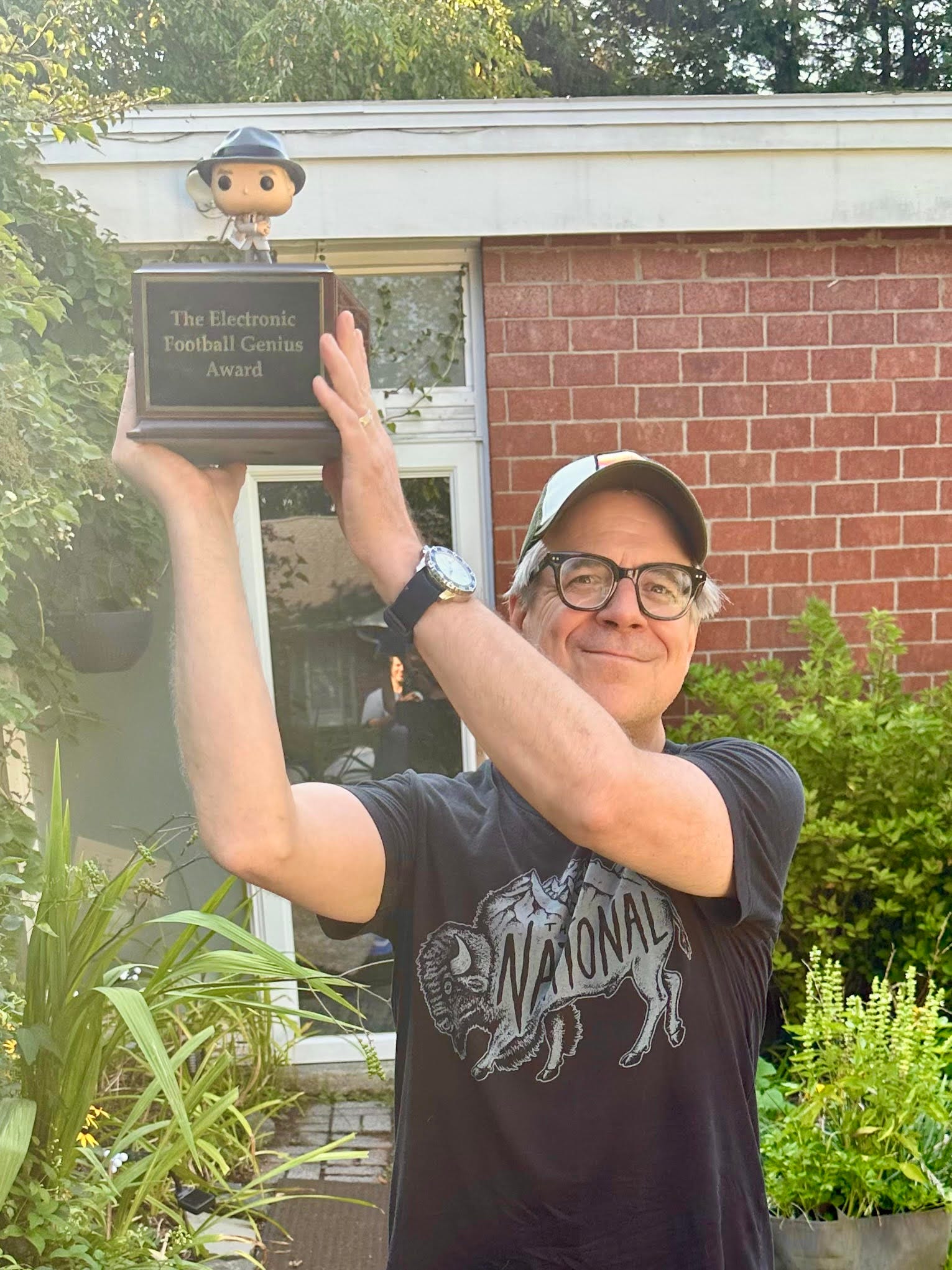 I’m still holding out hope for the MacArthur Award, but I’m not, like, lobbying for it. However, I did win a Genius Award, and I want to share it with you. This is the Electronic Football Genius Award, which I won because I won my Fantasy Football League, and this is what I got. I get to keep this for a whole year. It is a trophy, is an honor, it is a privilege, and it means that I did something. I went out and I beat eleven other guys at fake football. I did that!