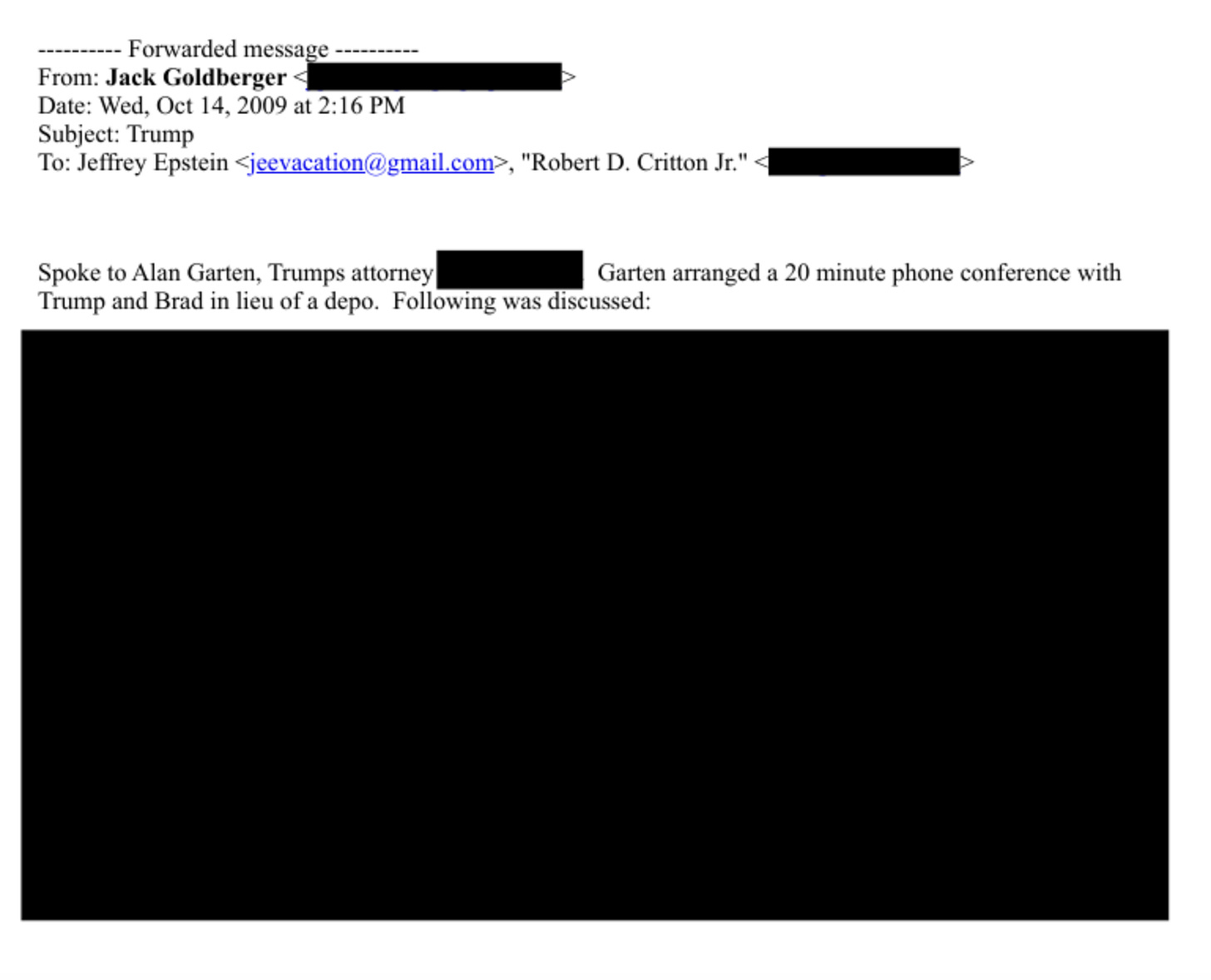 UpstateNY, my friend on Blue Sky, sent this to me. There was supposed to be a deposition by Trump in August of 2009 by Brad Edwards in that Ghislaine Maxwell / Epstein case. And apparently he never went to the deposition, but he had a chat with Edwards about it—and then totally redacted about what they talked about.