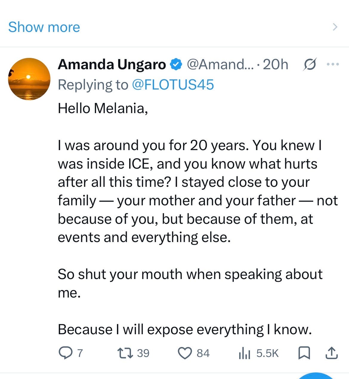 So Melania hastily did that. At no point in her denouncement of Epstein did she claim that Donald was innocent, notably; just that she was. So let’s keep an eye on that because I read on the social media that Amanda Ungaro is doing, or has done, an interview with a Spanish news station that’s airing over the weekend and concerns Melania. Anthony Andrews over on Twitter has done a lot of research into this, and they haven’t come after him yet, which is curious and probably means he’s right about the stuff he’s saying.