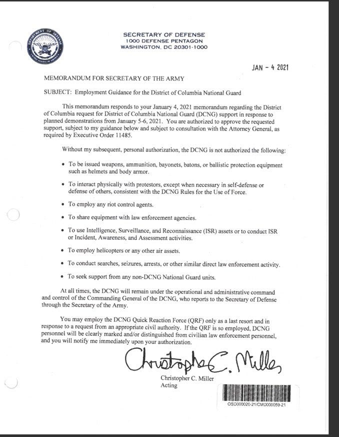 Sandi Bachom, the documentary filmmaker who witnessed and recorded the events of January 6th, insists that Christopher Miller, the Acting Secretary of Defense who replaced Mark Esper right after Trump lost the election, was the only person other than Trump with the authority to send in the National Guard. He turned down over a dozen requests to do so on January 6th, she says, two days after writing this curious memo: