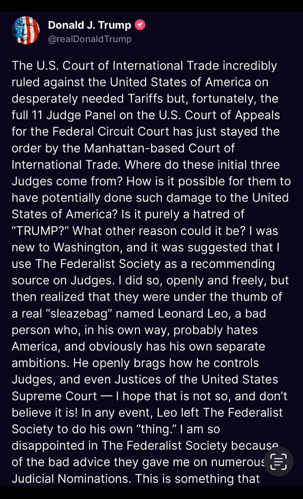 Leo has hand-picked five Supreme Court Justices, including all three Trump selections, and bears one of the more comic-book-villain names in recent memory, but the media wouldn’t touch him—until this week, that is, when, irked at a lower court torpedoing his tariffs, POTUS lit into Leo on Truth Social, calling him “a ‘sleazebag’ . . . a bad person who, in his own way, probably hates America, and obviously has his own separate ambitions.”