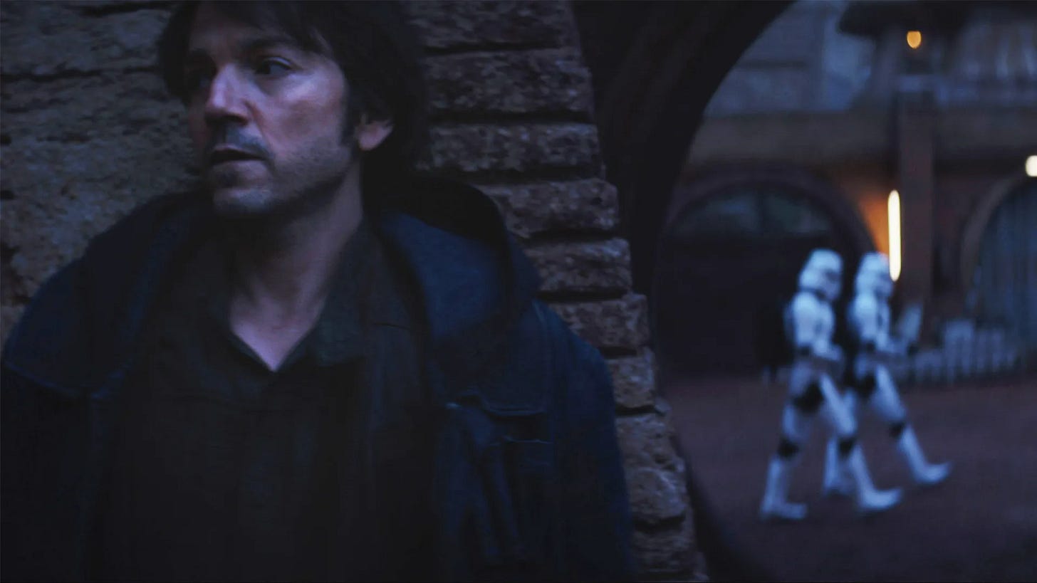 At first, the eponymous Cassian Andor, played beautifully by Diego Luna, looks and sounds and acts so much like Inigo Montoya from The Princess Bride that it felt intentional. (This is not a bad thing, because who doesn’t love Inigo Montoya?) But the character rounds out into something moving and real. The series involves his hero’s journey from mercenary scoundrel to ardent revolutionary: from and/or to all in.