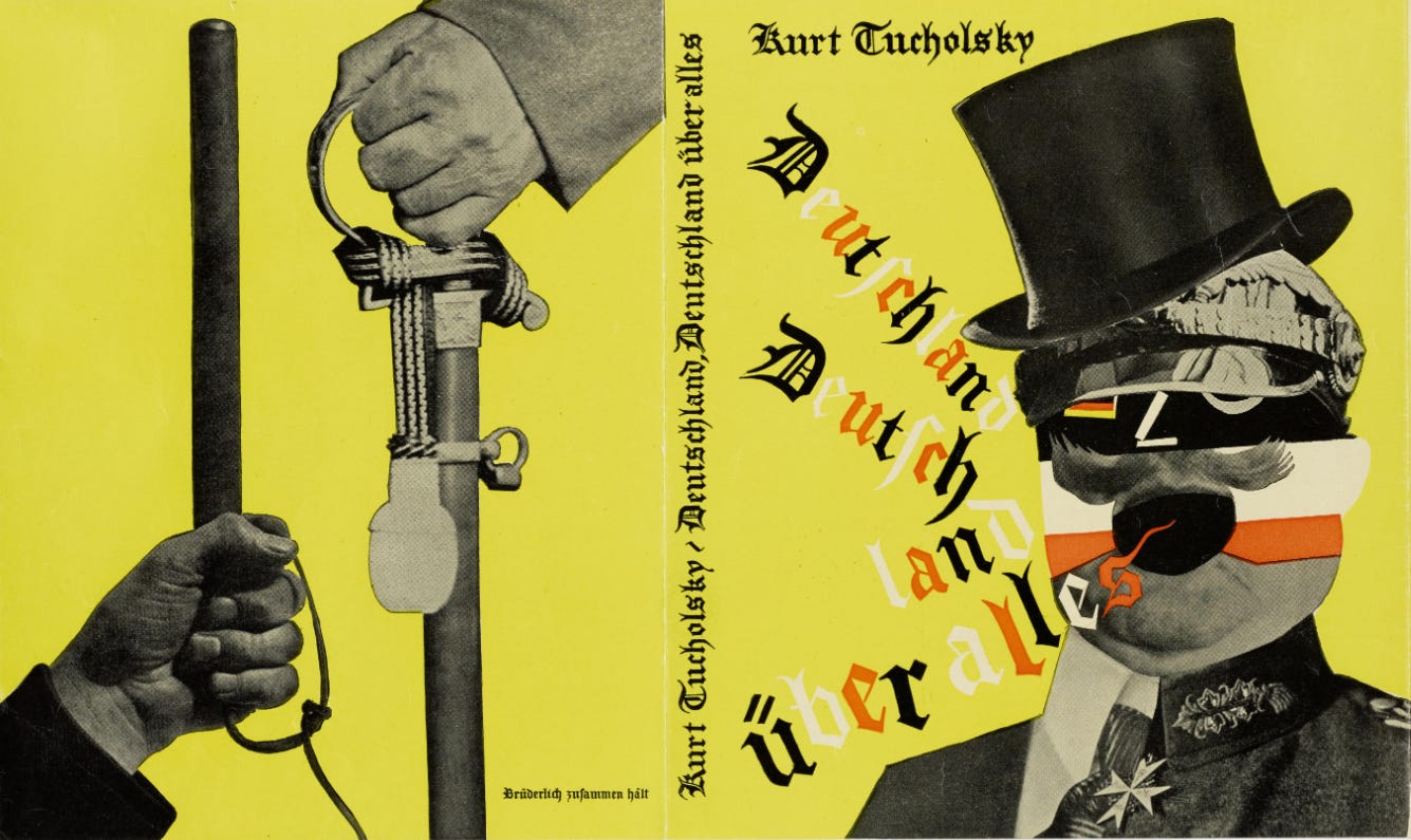 I don’t need to tell you that this exhortation fell on deaf ears. Tucholsky spent the rest of the decade railing against Nazis, political violence, and war, and fiercely defending human rights, democracy, and the existing government. This was in vain. “They are preparing for the journey to the Third Reich,” he wrote, before the Third Reich was a thing. And, later: “You don’t whistle against an ocean.”