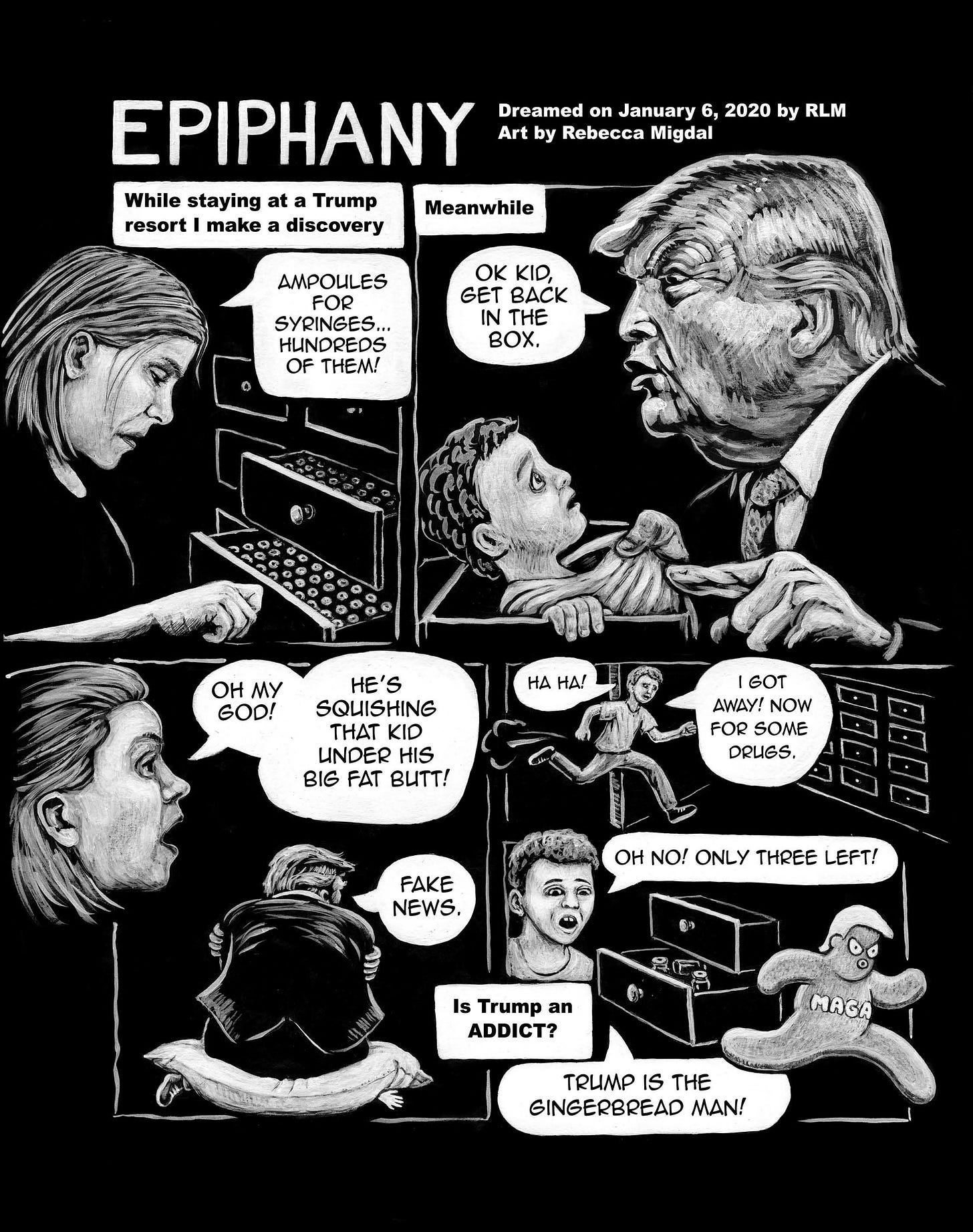 In her short comic, Migdal turns a bad dream into comic art. This is an actual nightmare that she really had…which, again—the President has ruined sleep, too. To paraphrase James Joyce, Trump is a nightmare from which we are all trying to awake.