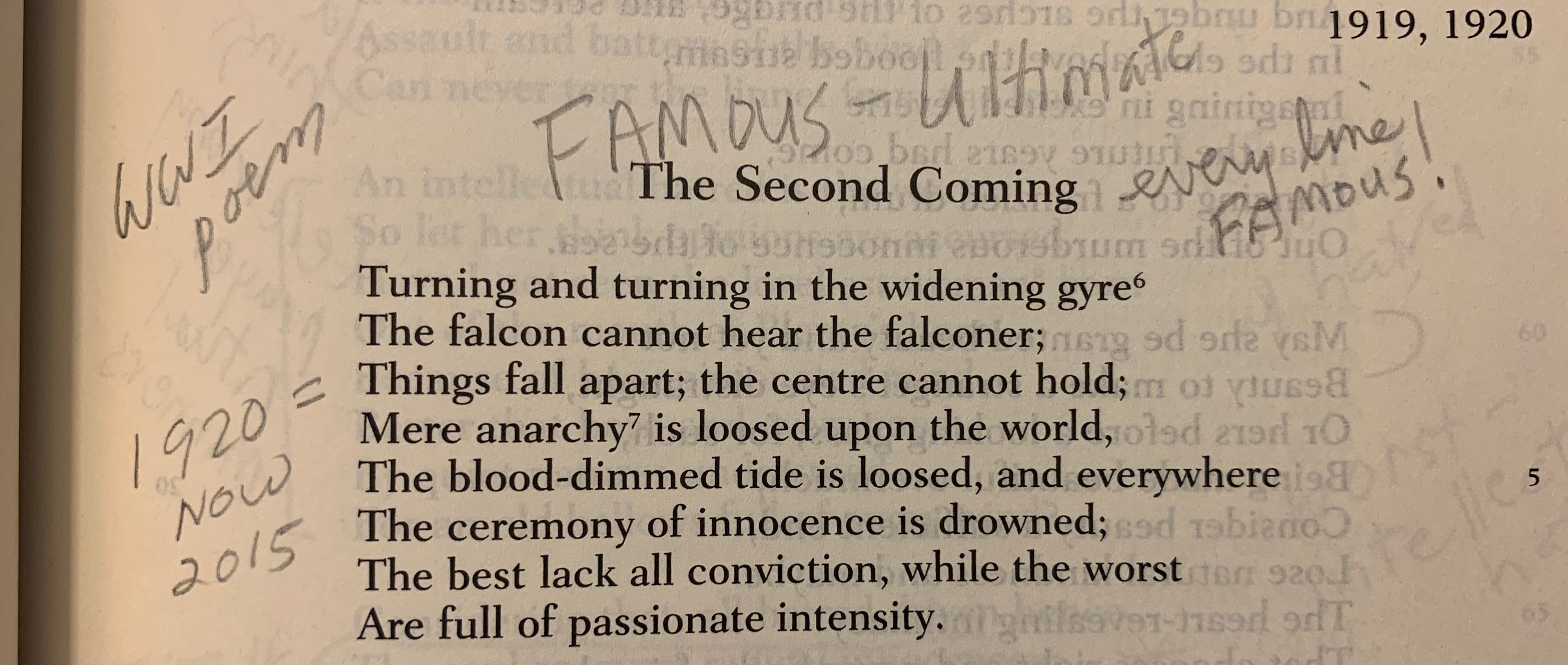 At the book fair last year, I scored a lovely copy of Volume 1 of the Norton Anthology of Modern and Contemporary Poetry. Not only is this a delightful volume, but it contains handwritten annotations by some meticulous poetry student who took dutiful notes in the margins. What reader of verse cannot be charmed by this: