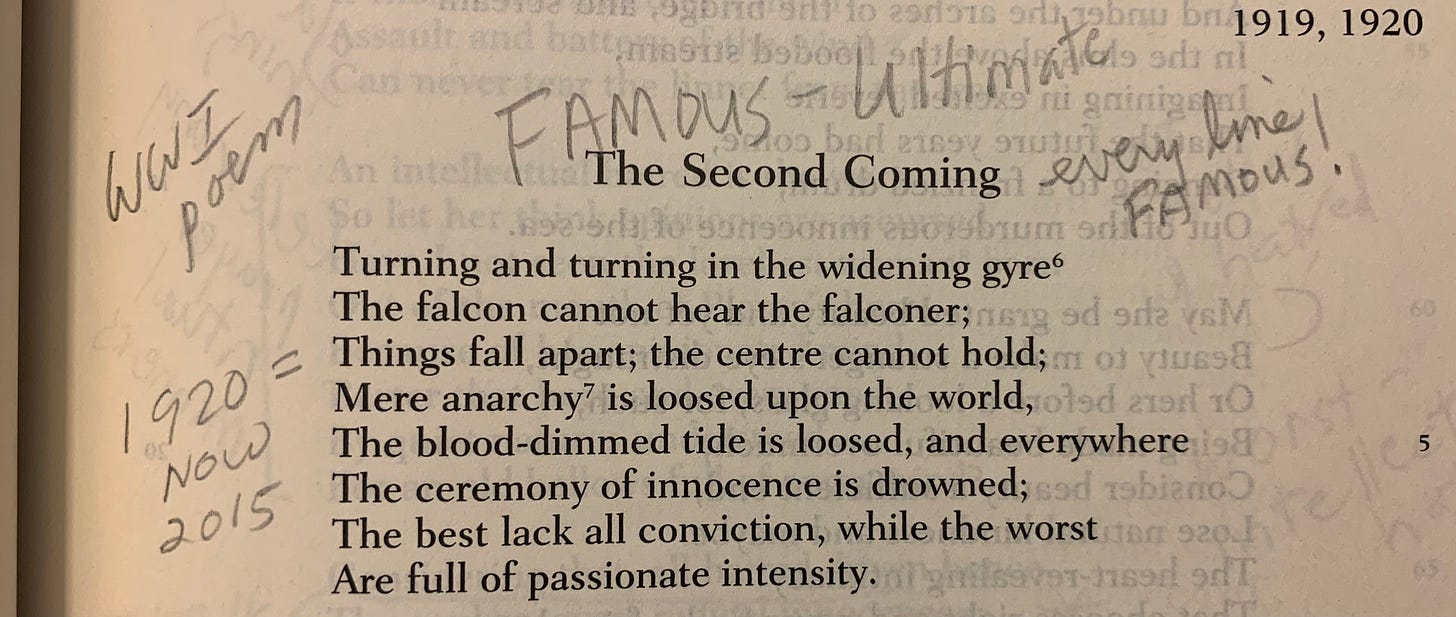 I’ve written previously about “The Second Coming,” the “famous-ultimate” poem William Butler Years wrote after the Great War, back in September of 2021—the early days of the Biden-Harris administration and the latter days of the pandemic. “Has the world gone mad?” I asked at the opening of the piece. But 19 months later, the examples of madness cited then seem quaint next to what’s been happening since. Too, the poem is so good, and so of the moment, that I wanted another crack at it.
