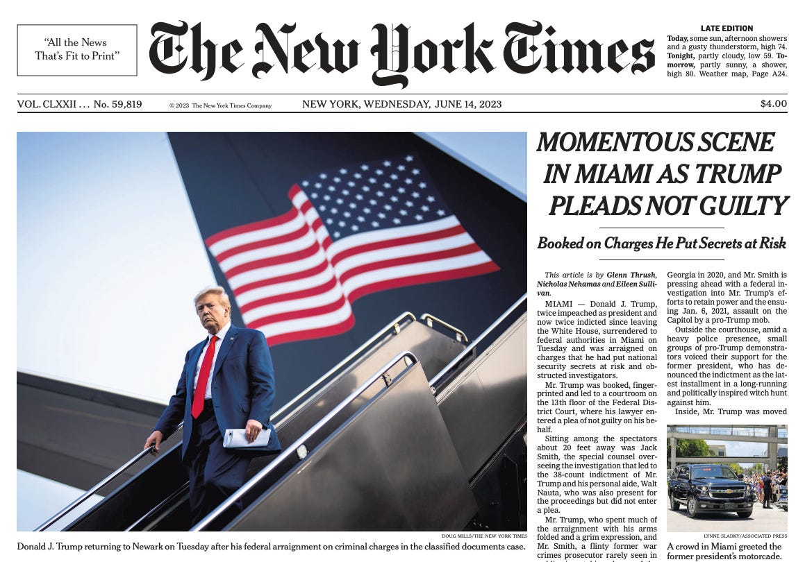 Denying us the right to bear witness to this historical spectacle is a form of gaslighting perpetrated by the judicial branch. This is erasure of history. If the indictment didn’t exist, I would begin to doubt that Tuesday’s arraignment happened at all.