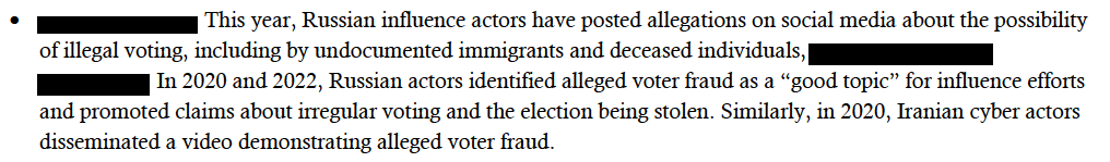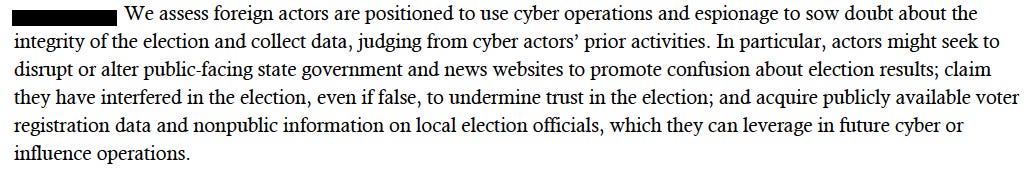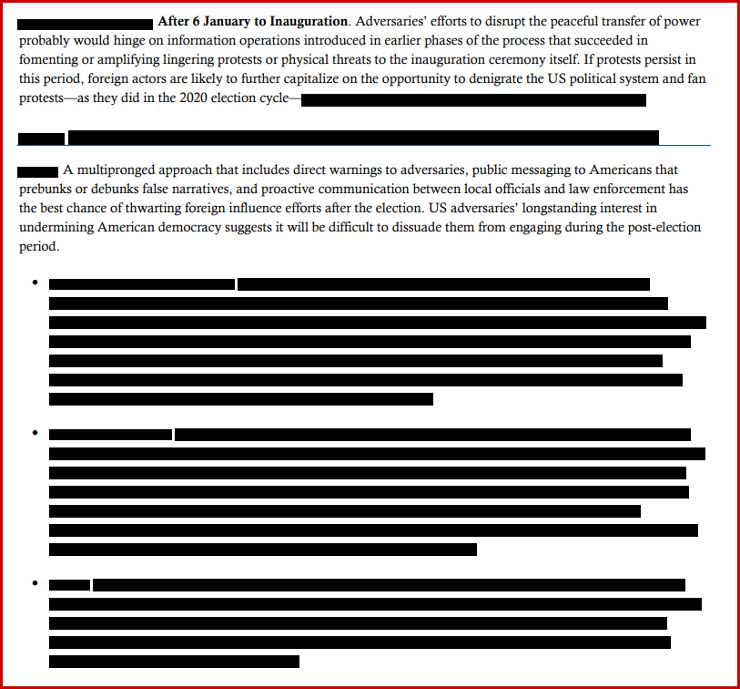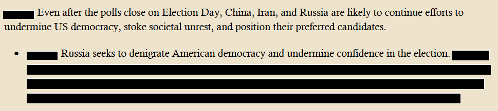 It is heartening to see that the Intelligence Community is on it. It is heartening to watch the DOJ make arrests of bad actors and shut down phony websites. It is heartening to know that the Biden Administration takes the specter of Russian election interference seriously. It is heartening to see that the highly-redacted last page of the NCI memo, which presumably lays out the IC’s plans to thwart the Kremlin’s bullshit offensive, looks like this: