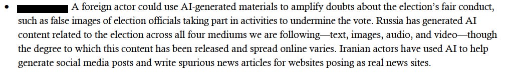 I’m not sure if John Mark Dougan is on that list of Americans, but the former Palm Beach County sheriff’s deputy, who fled to Russia in the wake of the Doppelganger indictment, has allegedly been paid by the Kremlin to make deep-fake videos intended to smear Kamala Harris. The NCI memo alludes to this deceptive technique, too: