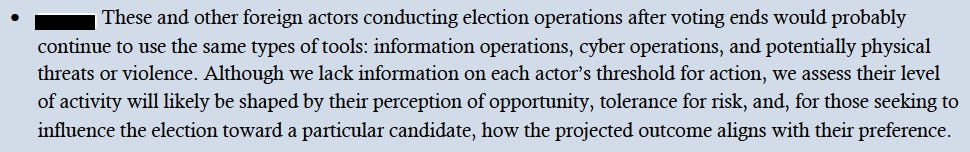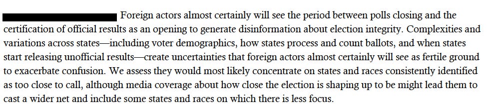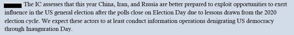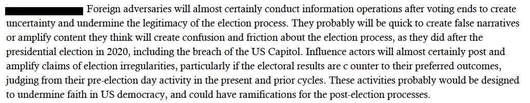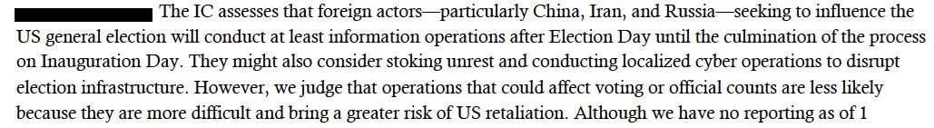 We also know this because the Intelligence Community told us. Two weeks ago, the National Intelligence Council issued a declassified report with the not-very-subtle title, “Foreign Threats to US Elections After Voting Ends in 2024.” Let’s look at a few highlights: