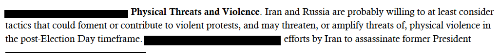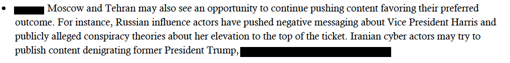 But Russia is different. Putin needs Trump to survive, as discussed. Look at the tenses here: The NCI memo says that Iran “may try” to hit at Trump; the Russians, by contrast, “have pushed” anti-Harris propaganda: