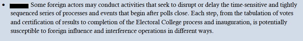 What jumps out at me about those passages is this: by attempting to “seek to disrupt or delay the time-sensitive and tightly sequenced series of processes and events that begin after polls close,” malign foreign actors—read: Russia—will be attempting to do what Trump and his allies tried in 2020, and are planning to try again this year: muck up the works, sow doubt and chaos, and hope some obscure technicality will achieve the desired outcome.